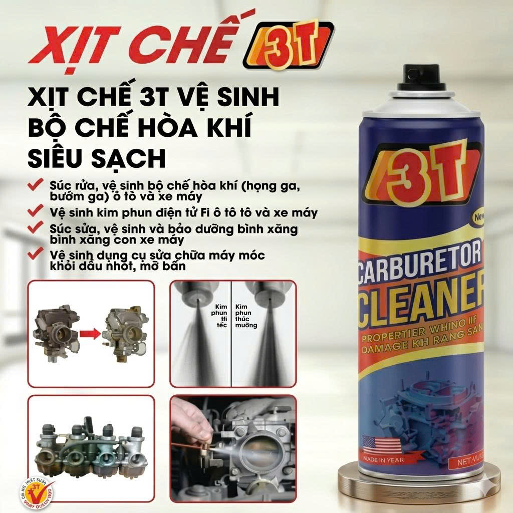 Trong đó, Xịt chế hoà khí 3T là dòng sản phẩm phổ biến, được nhiều gara và thợ kỹ thuật tin dùng nhờ hiệu quả làm sạch mạnh mẽ và dễ sử dụng.